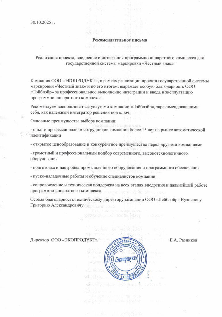 Рекомендательное письмо от ООО "ЭКОПРОДУКТ"
