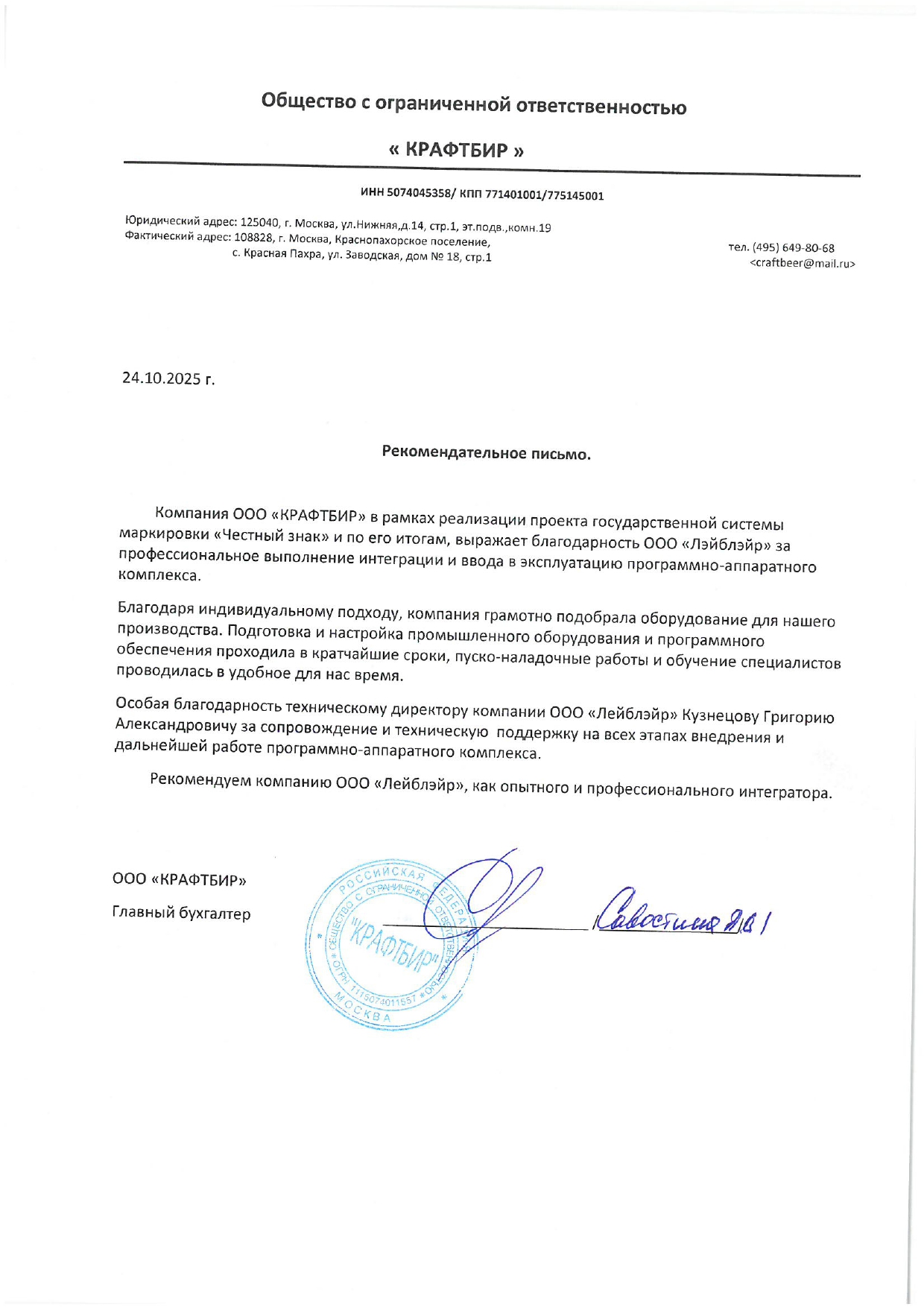 Рекомендательное письмо от ООО "Крафтбир"