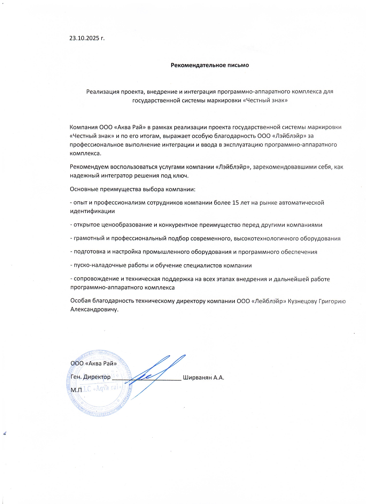 Рекомендательное письмо от ООО "Акварай"