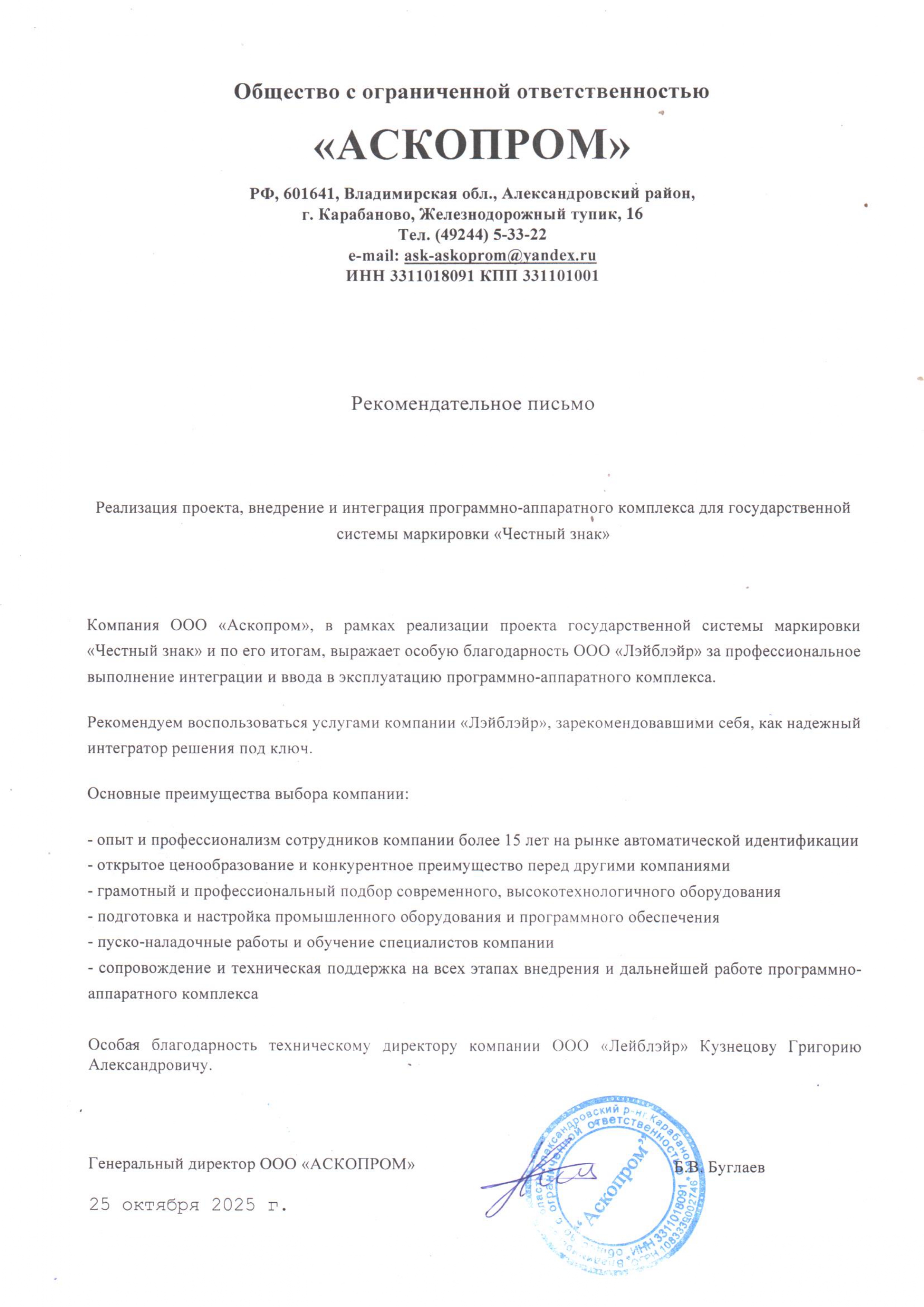Рекомендательное письмо от ООО "Аскопром"