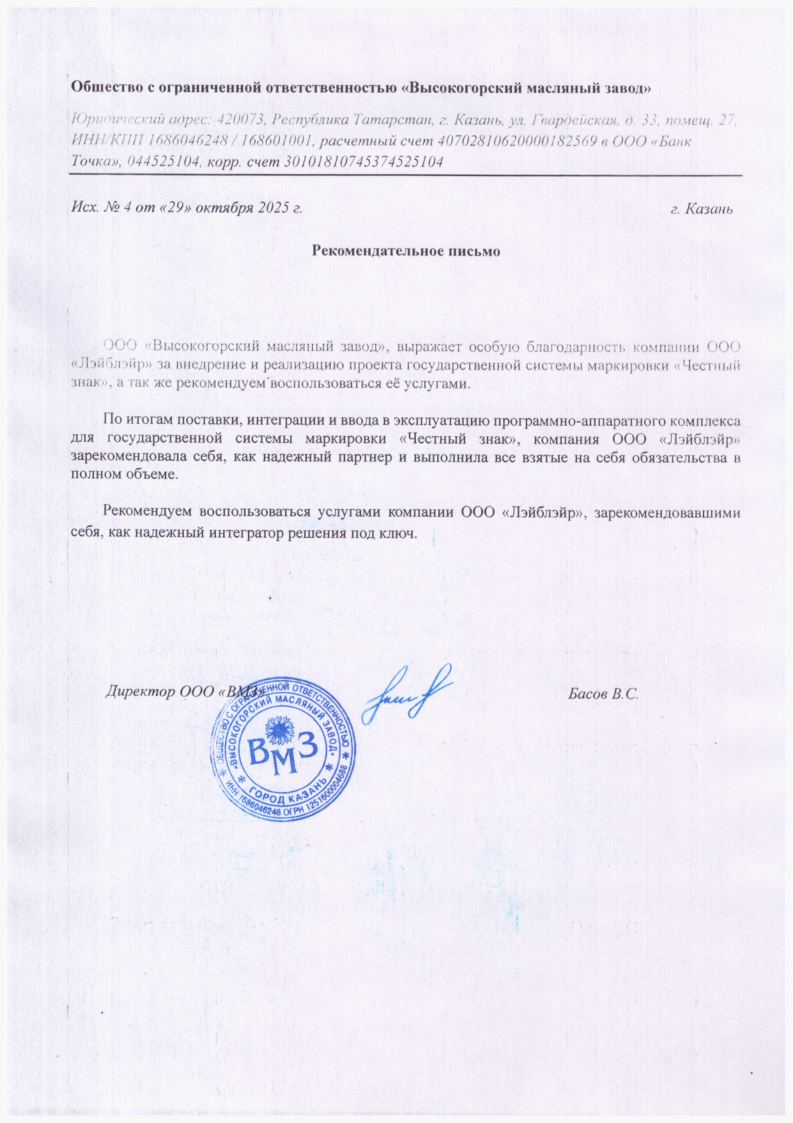 Рекомендательное письмо от ООО "Высокогорский масляный завод"